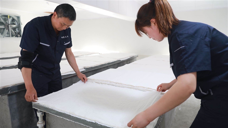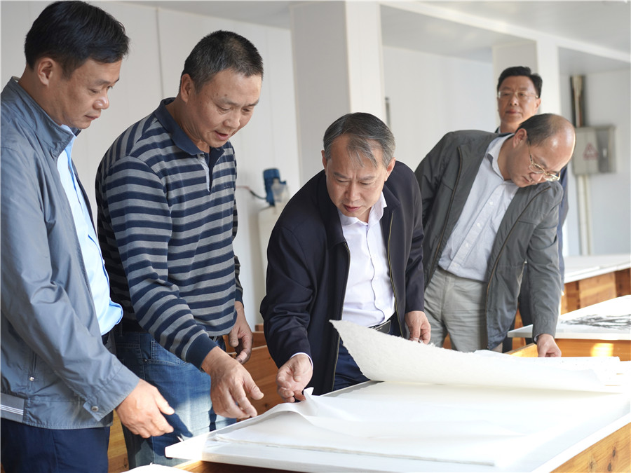 10月9日下午,縣長吳云忠赴海陽鎮(zhèn)凝霜文化發(fā)展公司調(diào)研徽州楮皮紙傳承與發(fā)展工作,縣委常委、海陽鎮(zhèn)黨委書記金學(xué)年,縣委常委、縣政府副縣長程衛(wèi)華參加調(diào)研活動(dòng)。 吳云忠一行實(shí)地察看了徽州楮皮紙生產(chǎn)工藝流程,認(rèn)真聽取企業(yè)負(fù)責(zé)人介紹,詳細(xì)詢問徽州楮皮紙制作工藝